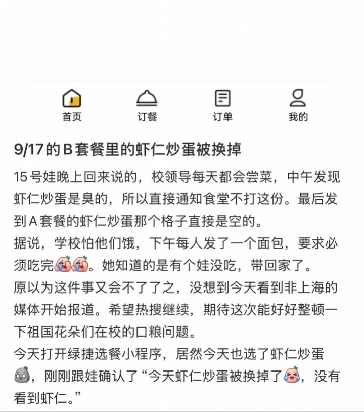 相关消息随即引发关注。南都记者注意到,有家长在社交平台发文称,“9月15日,孩子说今天的虾不新鲜,餐盘里直接少一个荤菜,绿捷和学校能做点好事吗?”同时,有家长表示,“学校9月17日套餐里的虾仁炒蛋也被换掉。”还有家长发布了学校补发面包的配料表,并质疑面包中的添加剂含量过多。