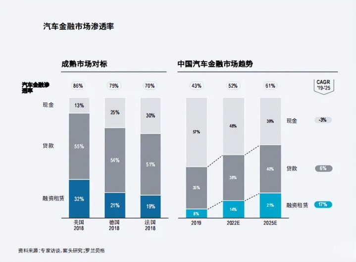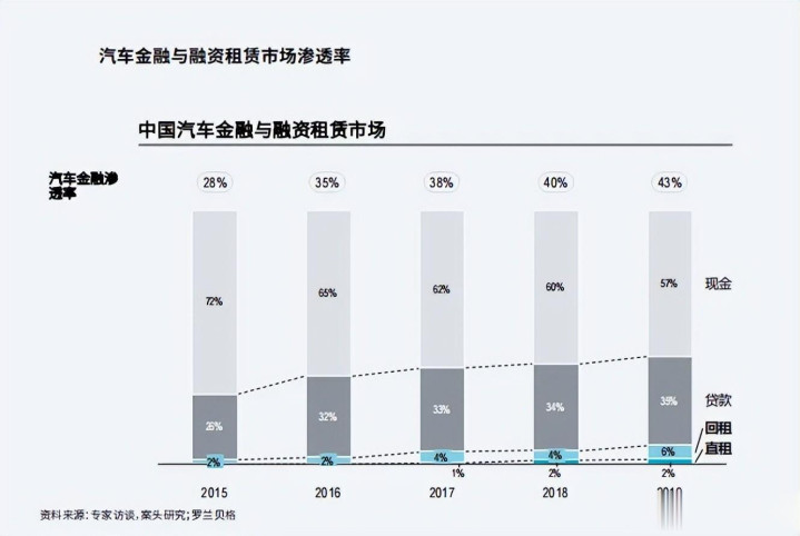 中国已成为全球最大的汽车消费市场,汽车金融也日益成为各方关注的焦点。也是参照罗兰贝格的数据,2019年我国的汽车金融整体渗透率约为43%,其中汽车贷款类业务占比35%,融资租赁回租(类信贷)占比约为6%,融资租赁直租(以租代购)占比约为2%。