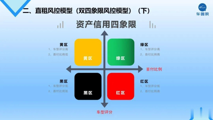 前面提到了,汽车以租代购和汽车消费信贷的基础逻辑不同,对应的客户群体、推广方式、渠道方式等等都不相同,那么对应的风控体系也是不一样的。