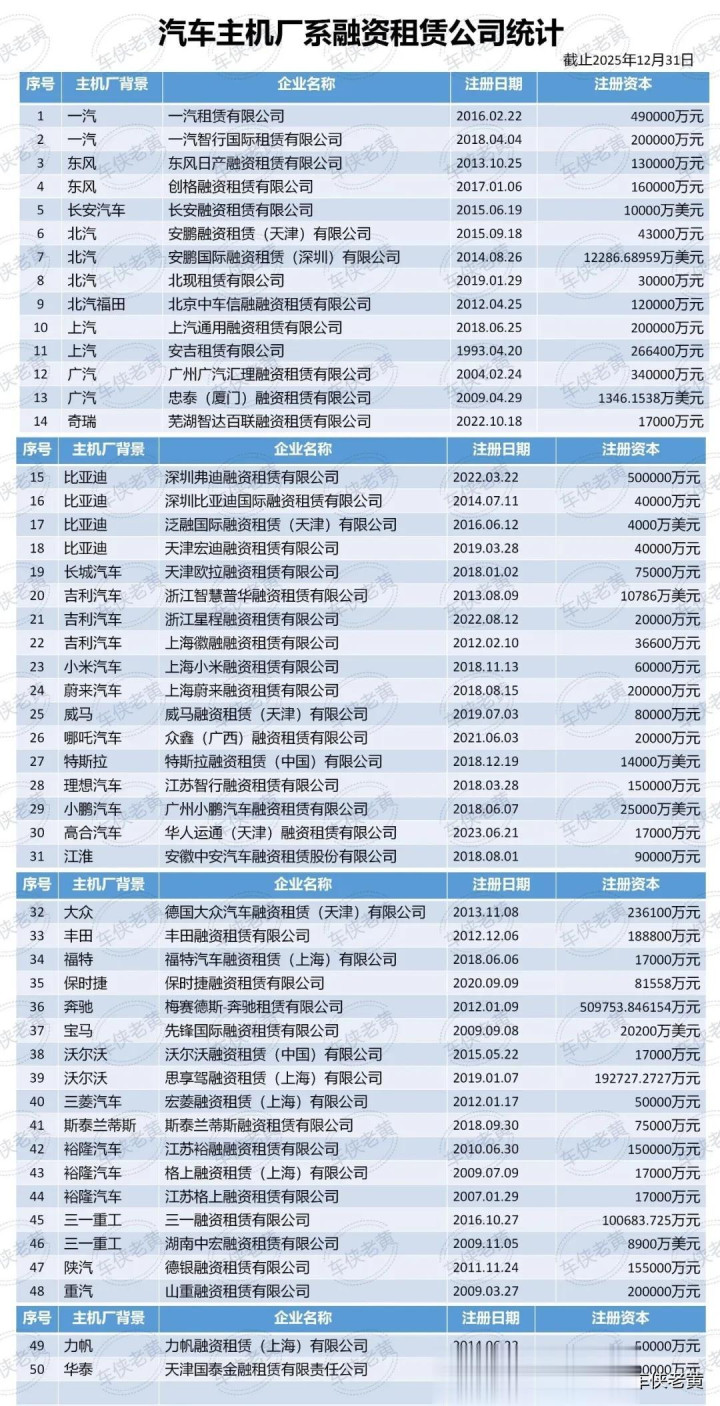 截止2025年12月31日,汽车主机厂系融资租赁公司总计50家,具体如下: