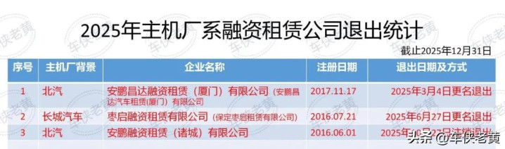 随着监管要求严格,2025年有3家主机厂系融资租赁公司进行了更名退出和注销退出: