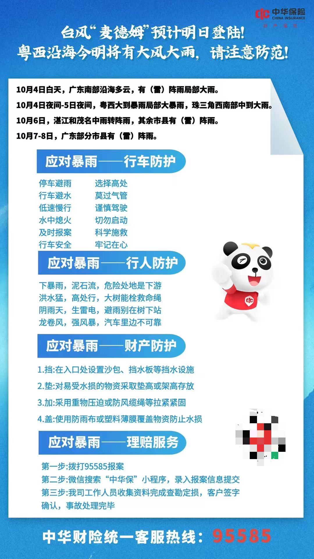 中华财险广东分公司严格遵循“保、防、救、赔”工作要求,紧盯气象预警信息动态,第一时间通过多渠道密集发布灾害预警与防灾提示,主动引导客户提前做好风险防范,切实消除安全隐患。